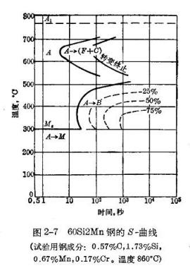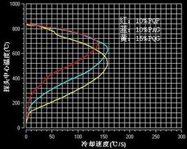 从图中3种淬火液的冷却特性对比分析,虽然最大冷速差不多为140~160℃/秒,冷却速度介于水油之间。对应于60Si2Mn的S-曲线看,650℃冷却速度太慢,发生铁素体析出,400℃的冷速太慢,有较多的贝氏体组织形成,达不到淬火所要求的硬度。