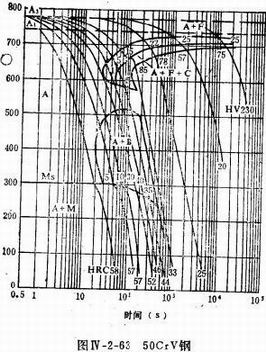从图中50CrV钢的连续冷却转变曲线图分析,若得到完全马氏体组织,在整个冷却过程中,在400-500℃的范围,要求冷速达到一定值,速率刚好大于等于临界点,不和S曲线的鼻尖处相交。在此处冷速越慢,非马氏体组织和贝氏体组织形成的越多,马氏体组织越少。